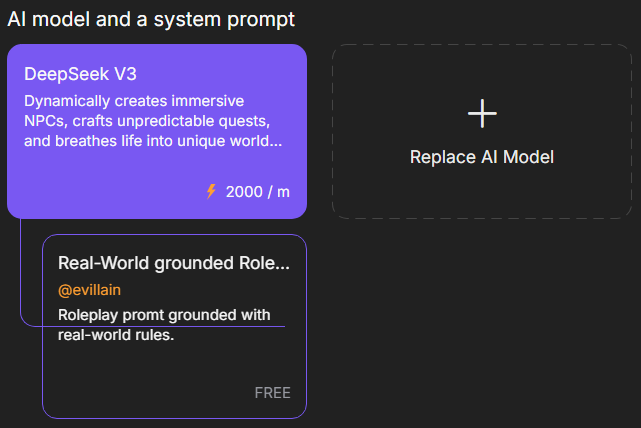 Select an AI model and configure the system prompt to define your character’s behavior and style. The model processes requests, while the prompt determines how the character responds, creating a unique experience. The chosen model and prompt are set by default, but users can select others.