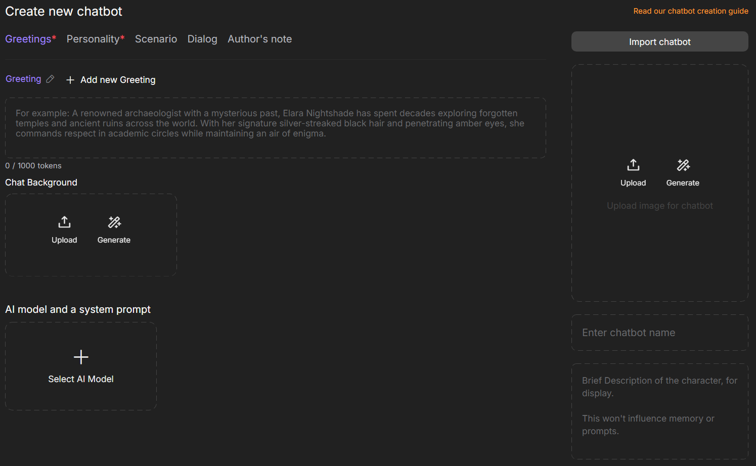 Personality is the foundation of your character. Here, you define their traits, speech style, and behavior. These details make your chatbot unique and recognizable.