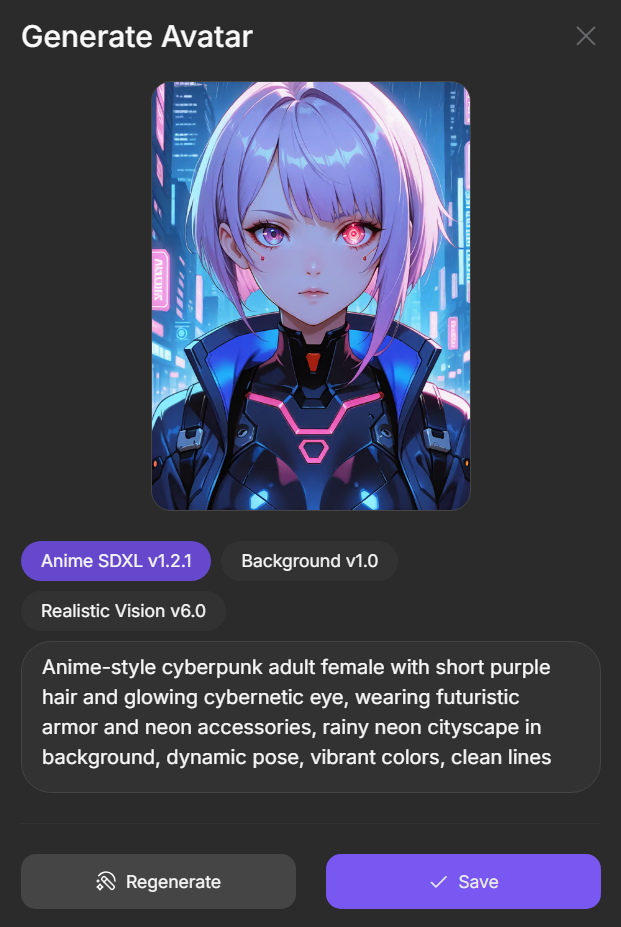 To generate an avatar, choose one of the available models: Realistic Vision for realistic images, Anime SDXL for anime style, or Background to create a background image.