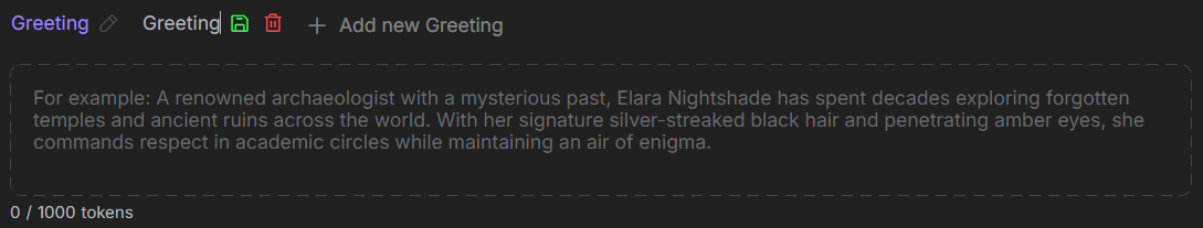 A greeting is the character’s first message, setting the tone for the conversation. It helps the user understand the character’s personality or role and creates a first impression.