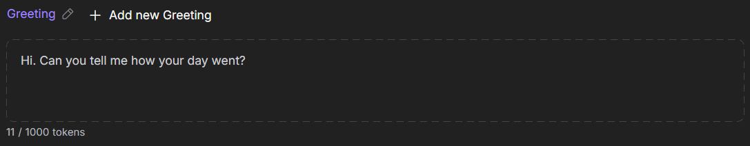 Keep an eye on your token budget when creating a character: the personality, scenario, greeting, and dialogue examples all use tokens. The number of tokens spent is displayed in the counter below the text field.